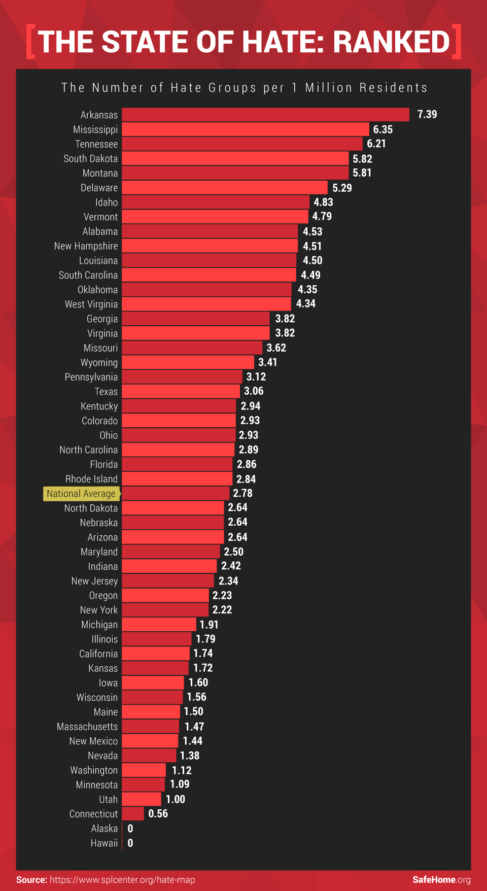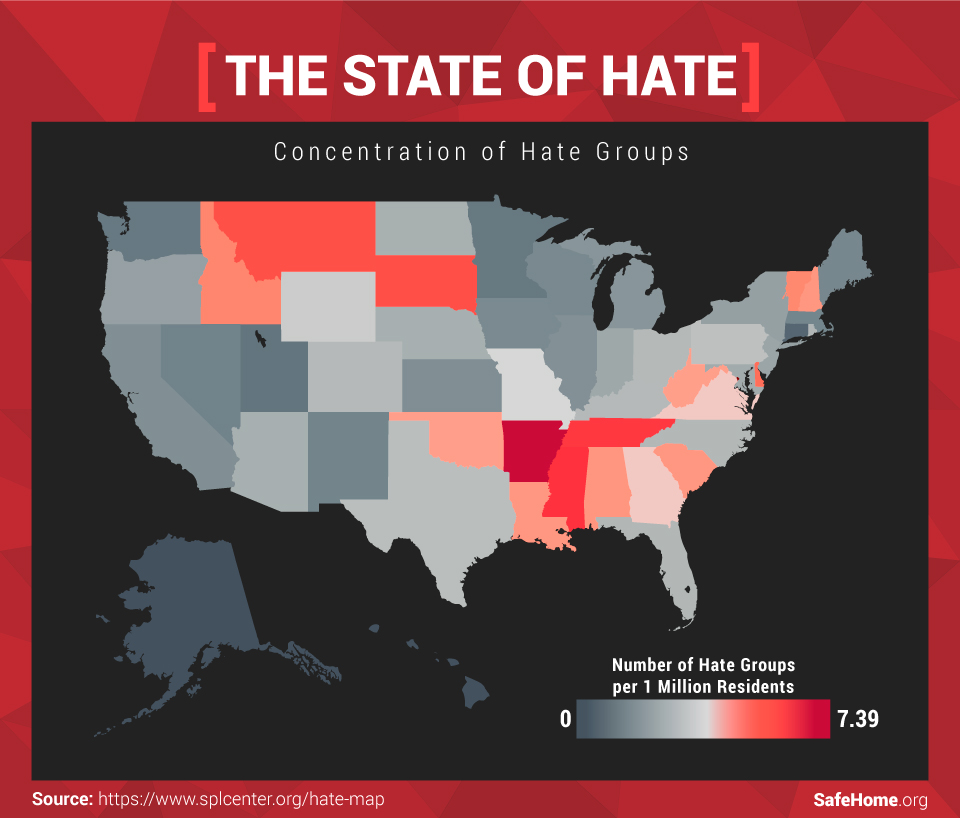 Other southern states like Mississippi and Tennessee (more than six hate groups for every 1 million residents each) followed Arkansas. Northern states like Montana and South Dakota (almost six groups) also ranked as areas with a high density of hate groups.
