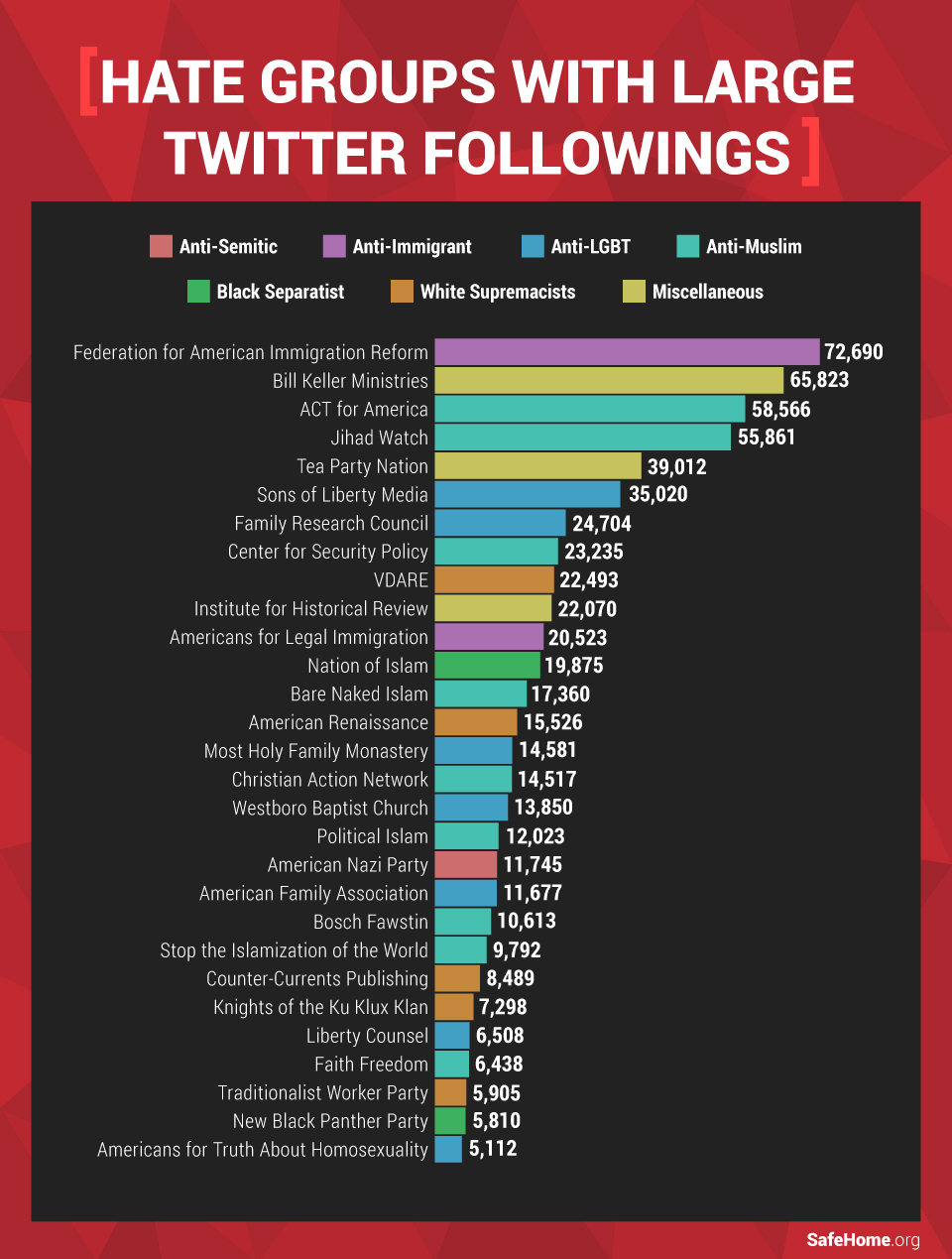 Other popular hate groups with 5,000 or more Twitter followers boasted anti-LGBT, black separatist, and white supremacist agendas.