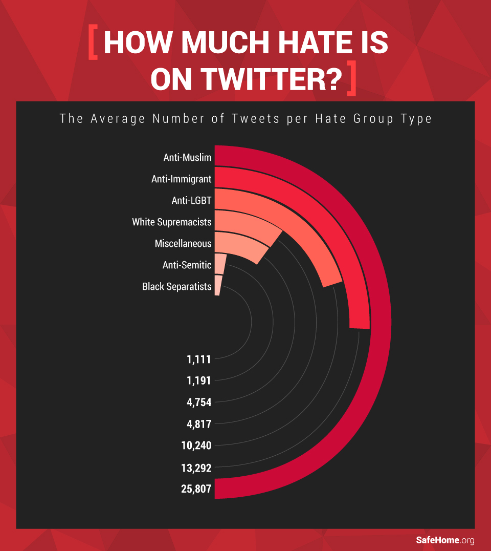 Of the more than 100 hate groups we were able to track on Twitter, we found that anti-Muslim accounts averaged almost 26,000 tweets and retweets. With accounts like ACT for America and Jihad Watch averaging over 55,000 followers each, the racist tweets targeted toward Muslims accounted for more of the hate group activity discovered than any other category.