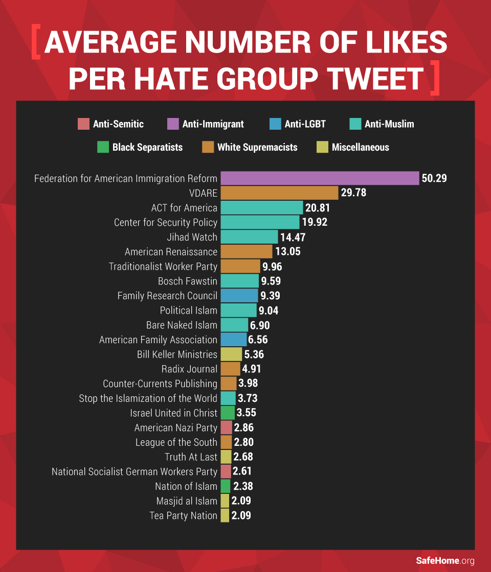 Anti-immigrant tweets were found to be the most hateful, and anti-immigrant group FAIR (Federation for American Immigration Reform) averaged the most likes of any of the hate groups studied, over 50 per tweet. FAIR averaged more than twice as many likes as nearly any other group that we looked at and had the most followers at the time of this publication.