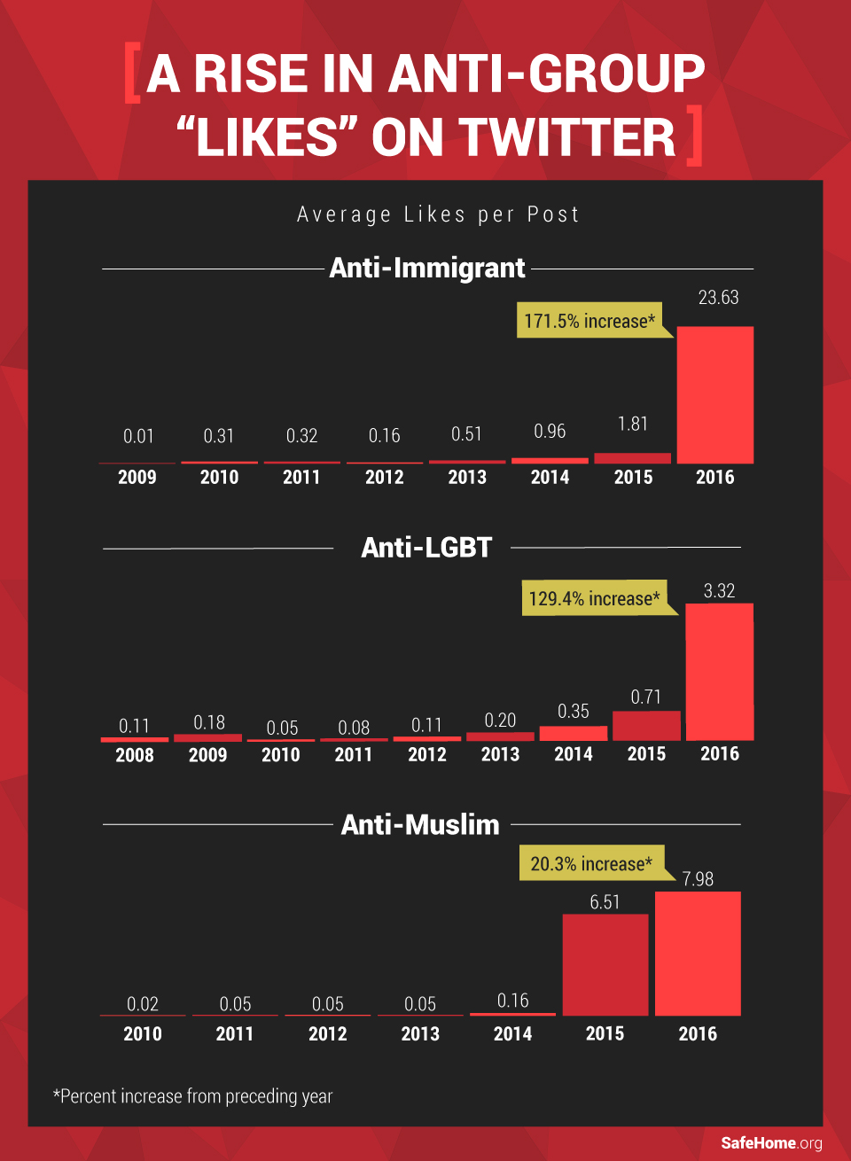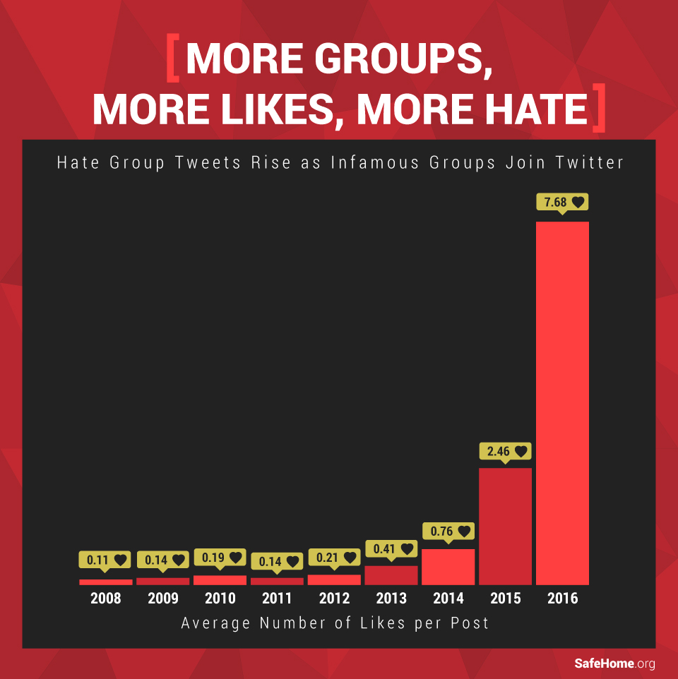 The presence of hate groups on Twitter has been growing since 2008, but between the close of 2015 and the end of 2016, we discovered some of the most dramatic increases in the number of likes of hate groups since Twitter’s founding in 2006.