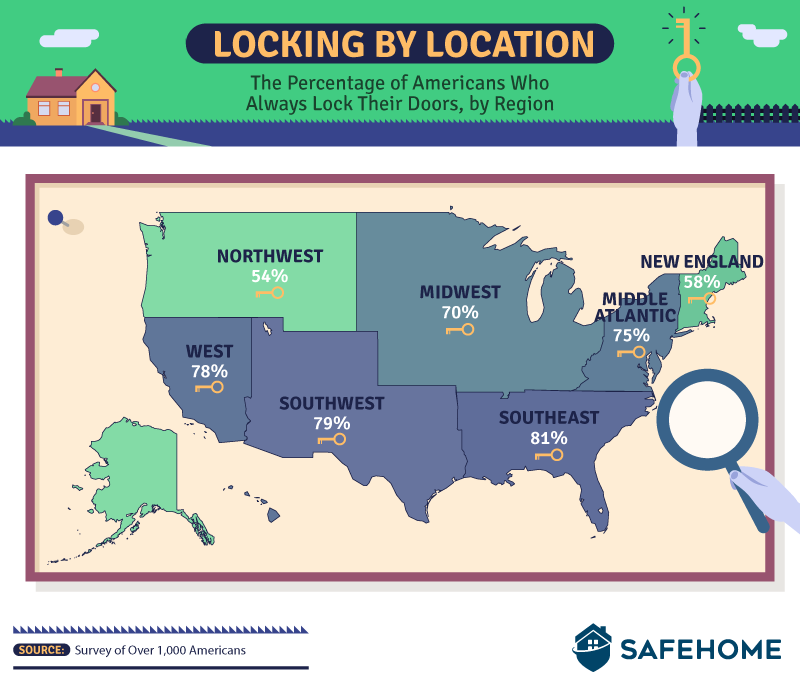 Southern hospitality seems to draw the line at leaving doors unlocked for unwanted guests. From coast to coast, more residents from the Southeastern part of the U.S. kept their doors locked at all times compared to anywhere else – with 81 percent always locking their doors. Alaska and the rest of the Northwest were the most lax with their locks: Only 54 percent of respondents said they always secured their doors.