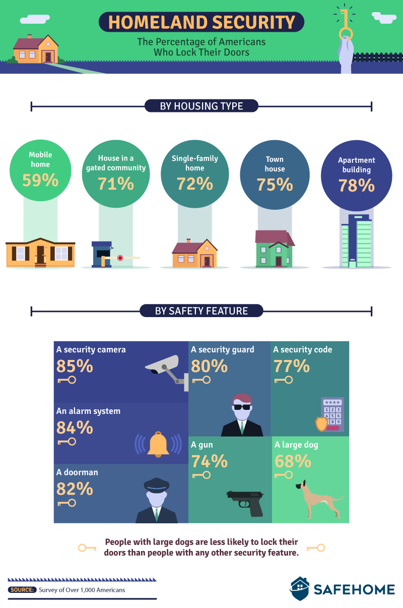 Keeping doors locked isn't the only security method people take. Depending on the method of choice, how likely are they to still lock their doors? Of those who kept a watchful eye with security cameras, 85 percent also kept their doors locked. Gun owners were 11 percentage points less likely to lock up, possibly because of their added protection of a weapon. The most interesting finding may prove that dogs really are a man's best friend after all: People with large dogs were less likely to lock their doors than people with security guards. While their trust may not be lying in their dog's ability to deal with an intruder, it's likely they think the presence of a large dog may ward off any attempts of a burglary.