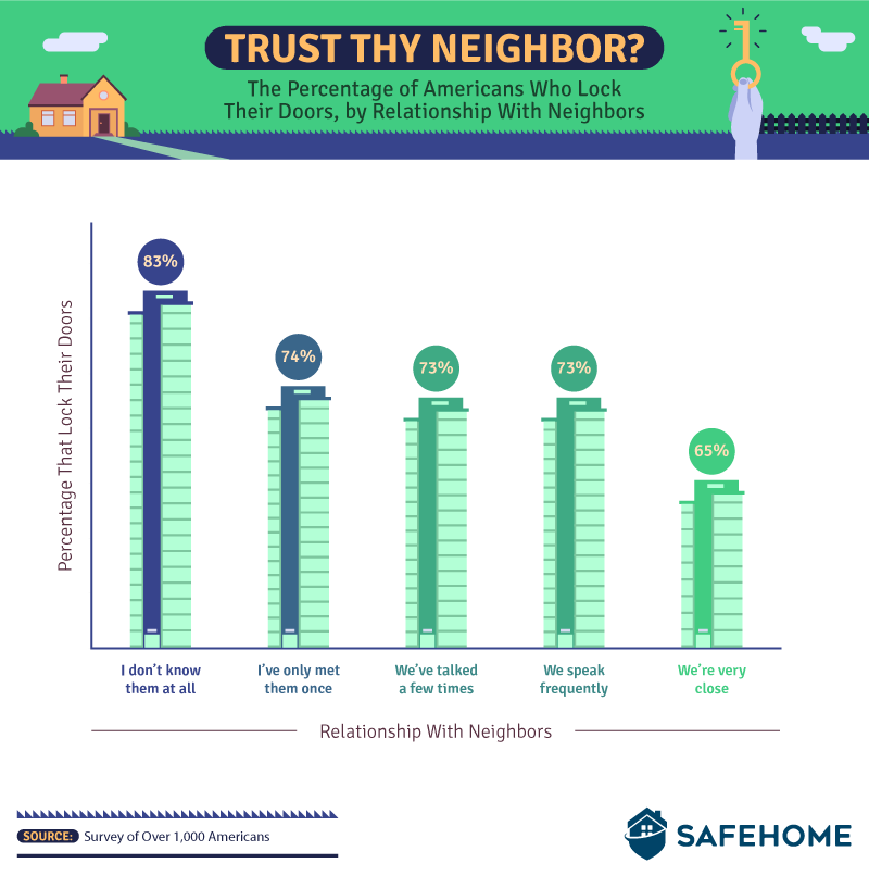 Getting to know your neighbors can be very beneficial, including an increase in the safety of your home. Eighty-three percent of respondents who didn't know their neighbors always made sure to lock their doors. And that percentage decreased as relationships with neighbors became stronger. Those who knew their neighbors very well were 18 percentage points less likely to lock their doors than those who had strangers living next door.