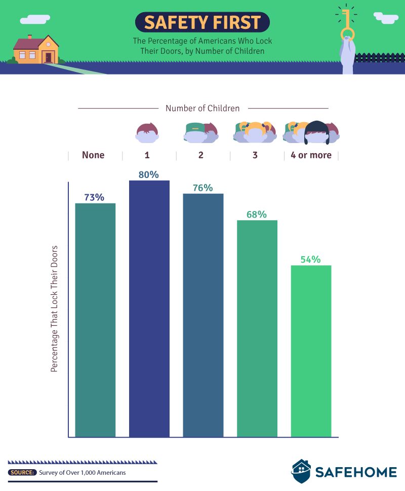 It happens – you're in a rush to get out the door, making sure you have everything you need, and you don't realize until it's too late that you've forgotten to lock the door. But add four children into the mix, and this could happen quite a lot more often. Seventy-three percent of people without any children locked their doors. But that number jumped to 80 percent when there was one child, and slowly decreased as more kids came into the picture. Why is it that the more kids someone has, the less likely they are to lock their doors? We have a few guesses.