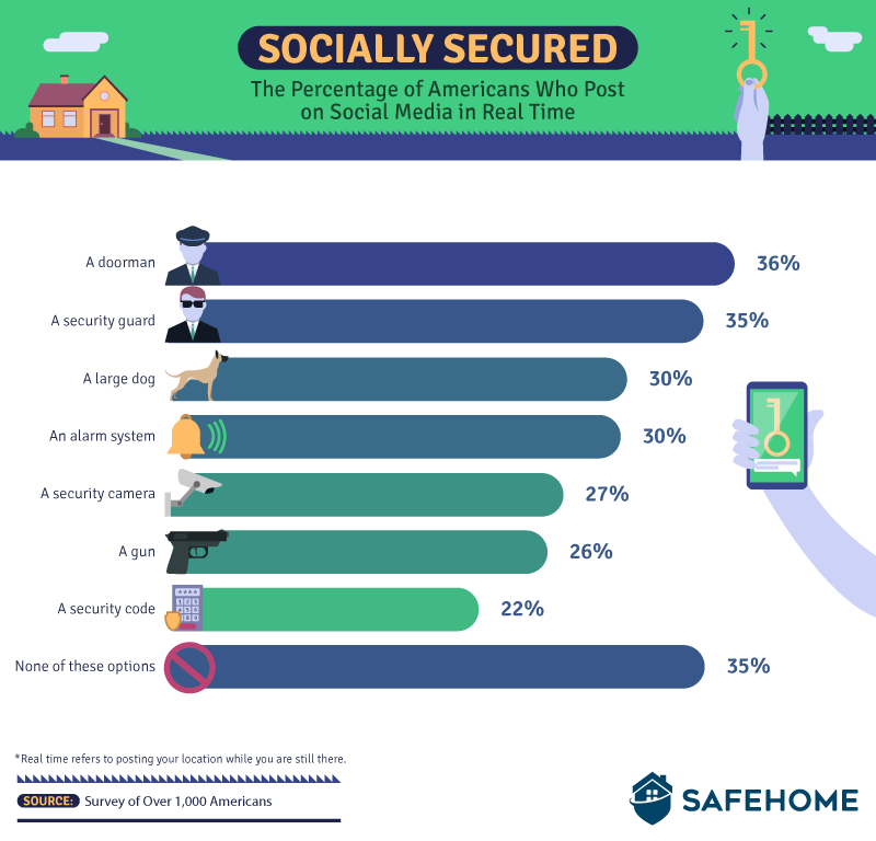 What security features make people the most confident in posting where they are exactly when they are there? It looks like man's best friend doesn't take the lead this time. Those living in a home where a doorman was present were the most likely to post in real time. Surprisingly, 35 percent of respondents who didn't secure their home with any of the systems we listed posted on social media in real time – more than any other form of security system besides a doorman or security guard.